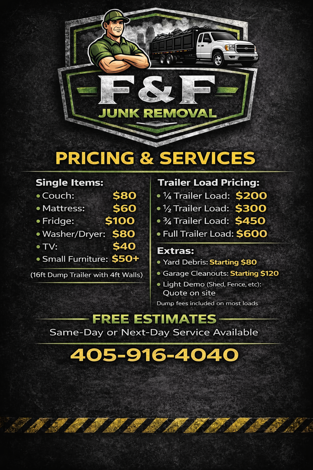 Is clutter piling up around your home or job site? Need dependable junk removal you can trust to show up and get it done right? At F&F Junk & Tree Removal in Arcadia OK, we provide professional junk removal services for residential and commercial customers who want fast, reliable results without the hassle. As a family-run, locally owned business, we take pride in serving our community with hard work and honesty.